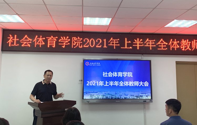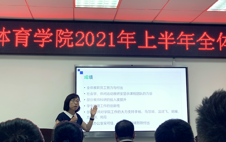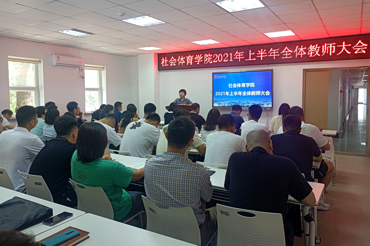 7月16日,社会体育学院在游泳馆大会议室召开教师干部大会,总结2021年上半年工作、部署假期工作安排。学院领导班子、全体干部教师参会。会议由学院办公室李杨主持。