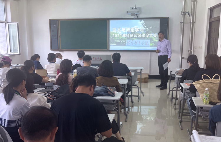 9月15日下午,武术与舞蹈学院党总支在科技楼410教室召开师德师风建设大会,学院全体教职工参加。