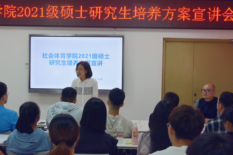 为帮助2021级硕士研究生迅速适应学习生活并做出合理规划,9月24日中午,社会体育学院在游泳馆二楼大会议室召开2021级硕士研究生培养方案(2021版)解读会。院长冯欣欣出席会议,学院2021级全体硕士研究生参加会议。会议由副院长徐通主持。