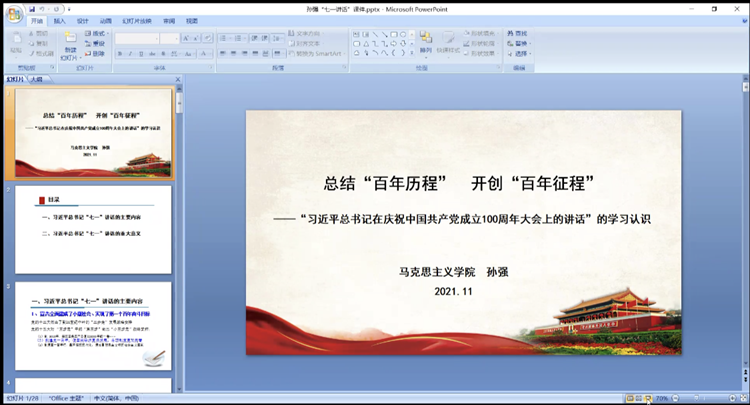 为深入学习贯彻习近平总书记在庆祝中国共产党成立100周年大会上的重要讲话精神,深刻认识党团结带领人民在百年接续奋斗中开辟的伟大道路、创造的伟大事业、取得的伟大成就,不断提高全体思政课教师政治站位,立足于落实立德树人根本任务,推动习近平总书记“七一”重要讲话精神进教材、进课堂、进头脑,11月5日,直属思政部党支部邀请沈阳工程学院马克思主义学院院长孙强教授作“总结‘百年历程’开创‘百年征程’——‘习近平总书记在庆祝中国共产党成立100周年大会上的讲话’的学习认识”专题讲座。