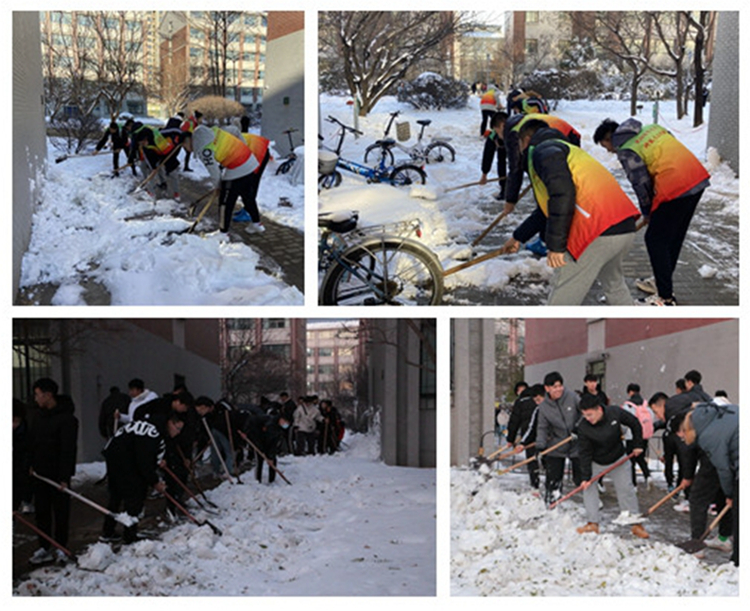 在校团委的号召下,校学生会、社团管理部、青年媒体中心、校园广播站、研究生会成员积极响应,共有近150名学生骨干参加到除冰扫雪工作中,雪后的天气异常寒冷,虽然湿滑坚硬的路面给清扫带来很大的困难,但也无法阻挡同学们的工作热情,此时的扫帚、铁铲成为了同学们手中最威武的作战武器,再大厚度的雪层也逃不过大家强有力的双手。扫帚的声音和铁铲的声音在大家的一致努力下浑然天成,编织成一首劳动之歌,幸福与快乐之感溢于言表。