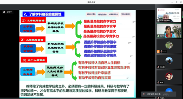 刘少英从吉首大学的学科发展趋势、学科建设以及如何将科学研究与学科可建设相结合进行了经验分享,为我院学科建设提供了可借鉴的逻辑理路;同时以国家社科基金课题申报为主线,从课题构思到撰写的各个环节进行了细致讲解,强调要把科研与教学结合起来,为教师搭建科研平台,营造“人人有课题,个个有论文”的研究氛围。