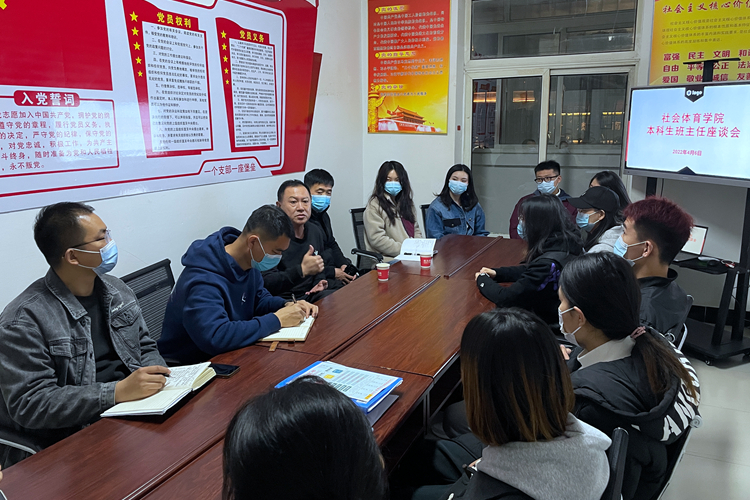 4月6日晚,社会体育学院在七号楼党员活动室召开“社会体育学院在校本科生班主任座谈会”,学校党委常委、学院党总支书记刘丙权,2020级、2021级辅导员参加,座谈会由党总支副书记赵宁主持。
