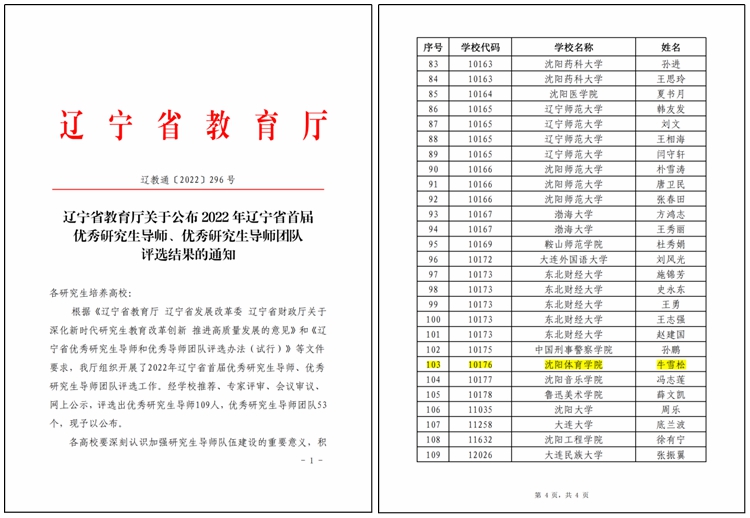 近日,辽宁省教育厅发布《关于公布2022年辽宁省首届优秀研究生导师、优秀研究生导师团队评选结果的通知》(辽教通〔2022〕296号),公布了2022年辽宁省首届优秀研究生导师及团队评选结果。本次共评出辽宁省优秀研究生导师109人、优秀研究生导师团队53个,我校牛雪松教授获评“2022年辽宁省优秀研究生导师”称号。