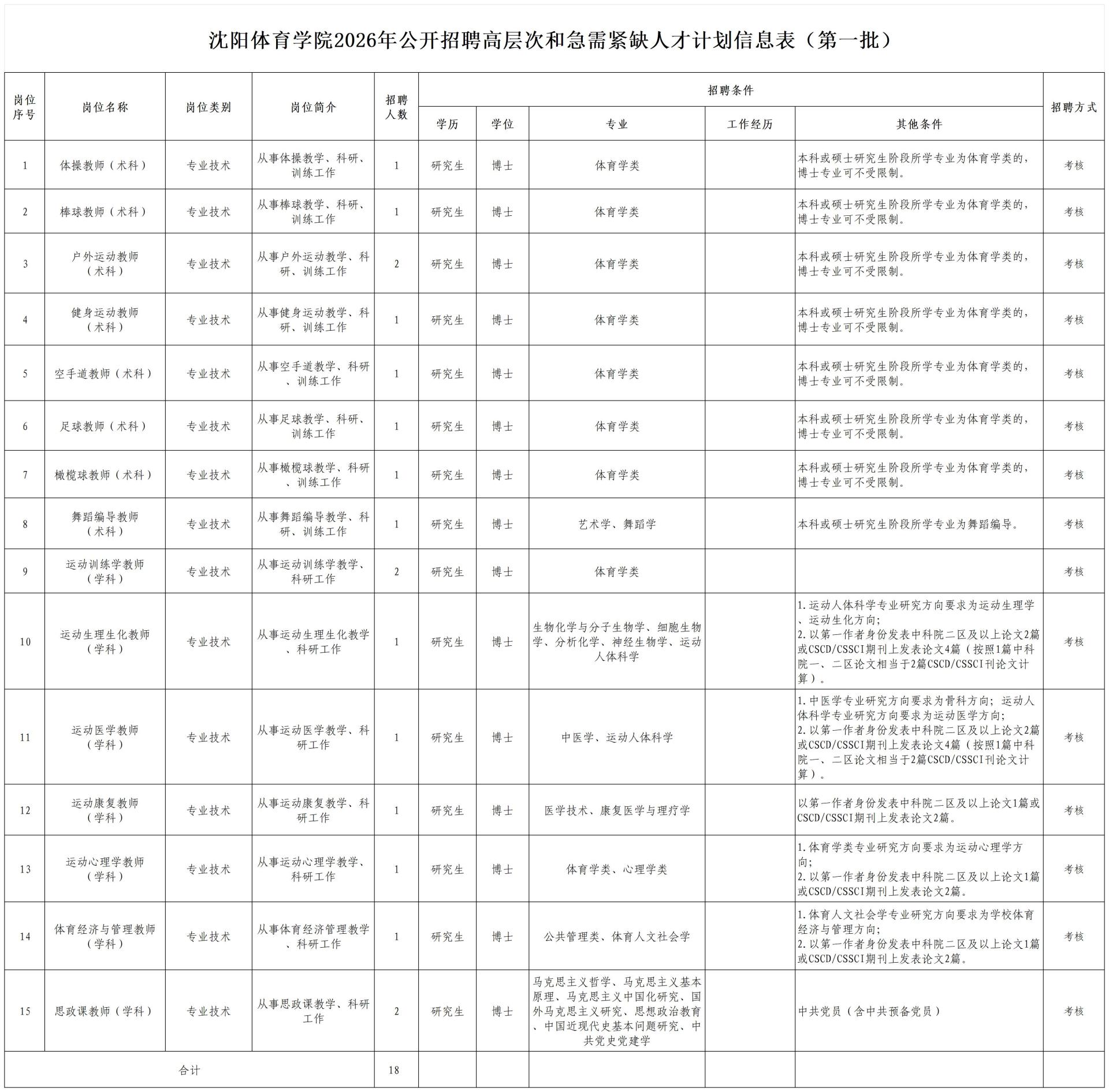 (五)岗位所需要的其他条件,详见《沈阳体育学院2026年公开招聘高层次和急需紧缺人才计划信息表(第一批)》。
