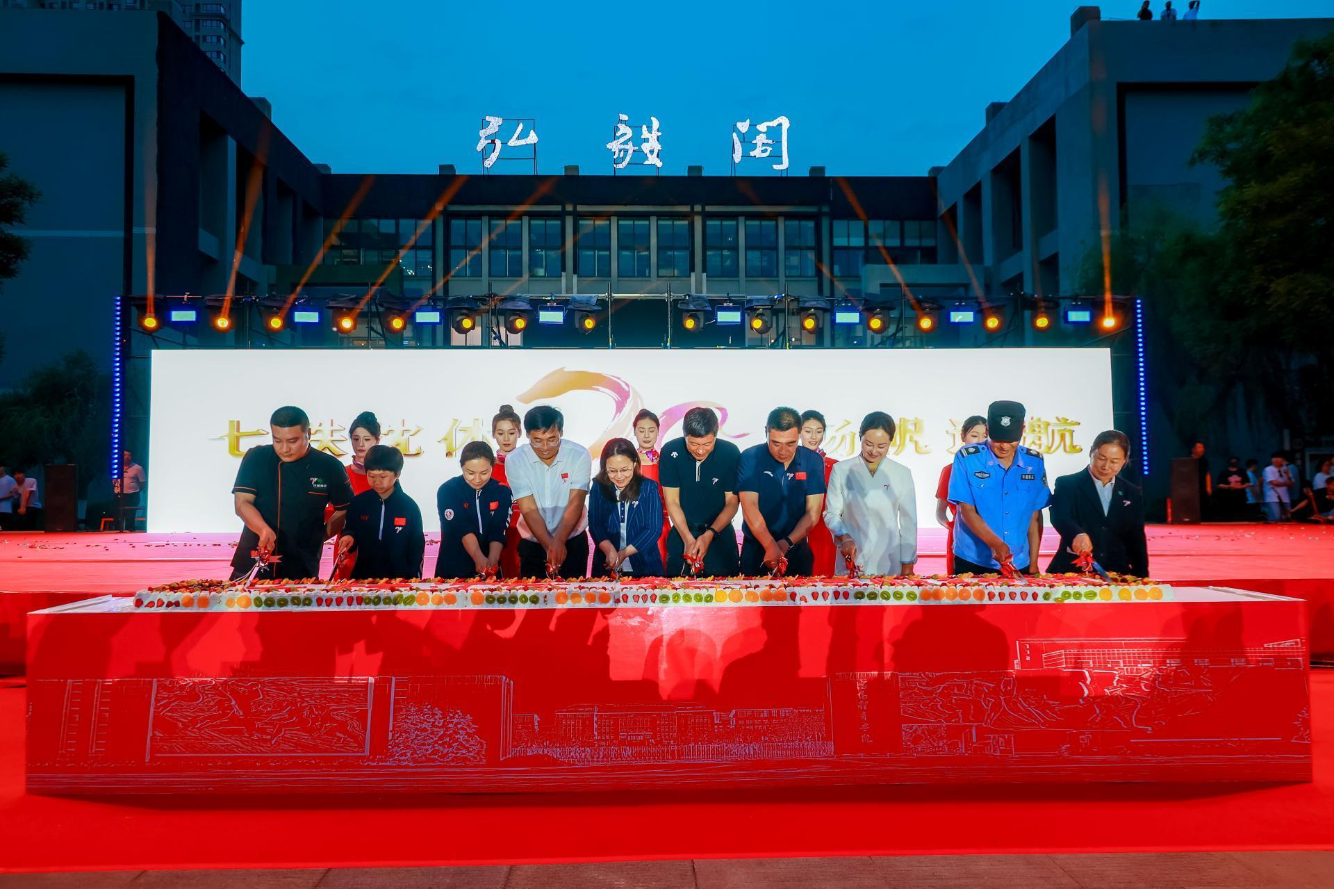 7米长的蛋糕镶嵌着“七秩沈体、扬帆远航”的建校70周年校庆主题,象征着沈阳体育学院走过的七十年砥砺奋进的历程。沈阳体育学院党委副书记笪可宁,党委常委、副院长于文军,党委常委、副院长李成梁,校友代表体育教育专业1996级校友、东北大学体育部副主任回军副教授,赞助企业代表云马翔和(沈阳)体育文化科技有限公司董事长闫潇,沈阳体育学院教师代表世界冠军、沈阳体育学院自由式滑雪空中技巧教练员郭心心,学生代表竞技体校小运动员代表李子懿,楼管员阿姨代表刘爱英,弘毅阁厨师代表王琦,校卫队保安大叔代表王荣胜,10位代表握着奋斗的手柄、切开象征美好未来的校庆标识蛋糕,与现场师生分享奋斗的甜蜜与成功的喜悦。