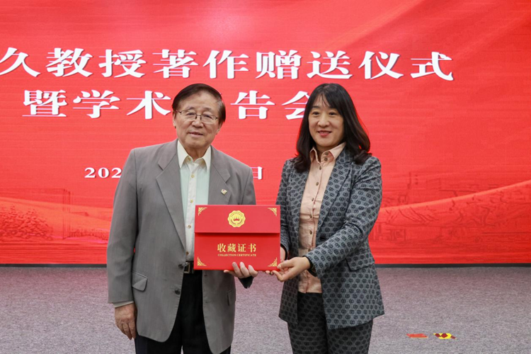 赠书仪式中,田麦久教授走向书桌亲手将凝结毕生心血的著作交到副院长李成梁和图书馆馆长庞宏娜手中,全场再次响起热烈的掌声。庞宏娜代表学校向田麦久教授颁发收藏证书。