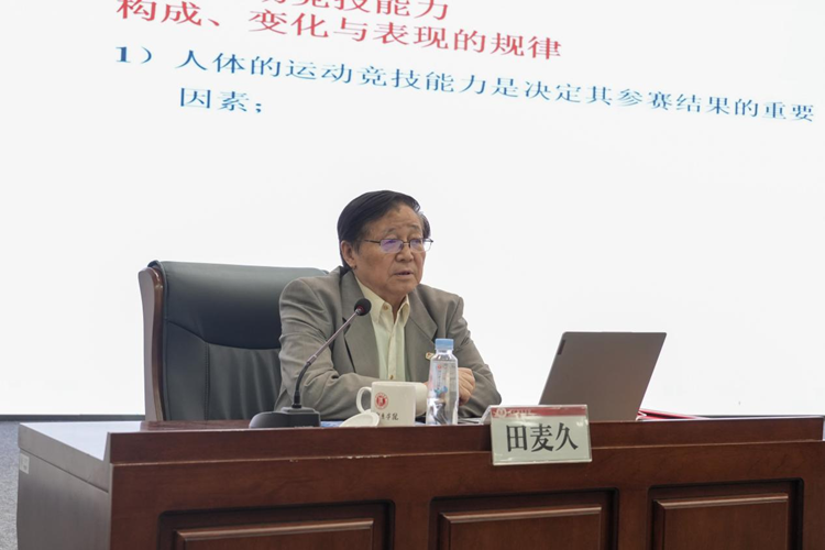赠书仪式结束后,田教授作题为“运动训练原则:从单轨思维到协同认知的演进”的报告。他声情并茂地介绍了运动训练原则概述、运动训练原则传统的单轨思维、协同认知训练原则的提出与演进、辩证协同训练原则的理论体系、辩证协同训练原则的理论与实践指导意义等方面的内容,并用专精的理论、鲜活的事件、亲身的经历和自己60年笔耕不辍融合在一起,通过精心准备的课件与现场的师生进行积极互动,呈现出深刻的学术见解和对青年学生的殷切希望。
