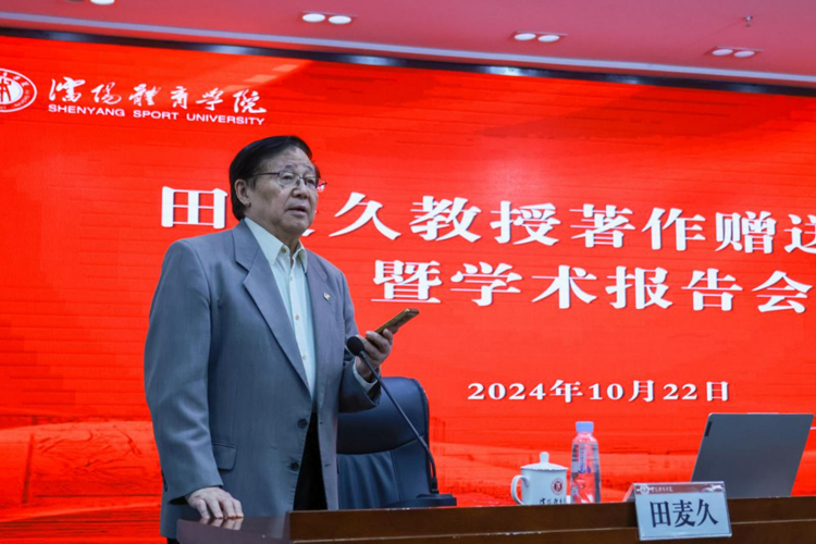 田麦久教授站在话筒前,满怀激情地说道:“今天我很高兴向沈阳体育学院赠送我的39部专著。这其中包括学术类30部,史传类4部,诗词类5部。”接着,田麦久教授向师生们简要介绍了所赠专著的创作背景。