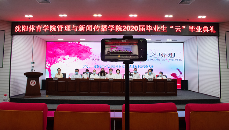 2020年6月18日上午10时,沈阳体育学院管理与新闻传播学院2020届毕业典礼在图书馆二楼报告厅举行。学院各专业教师代表、辅导员及部分毕业生代表现场参会。学院毕业生及没有教学任务的教师、在校生及家长等在“云端”共同参与了本次毕业典礼。
