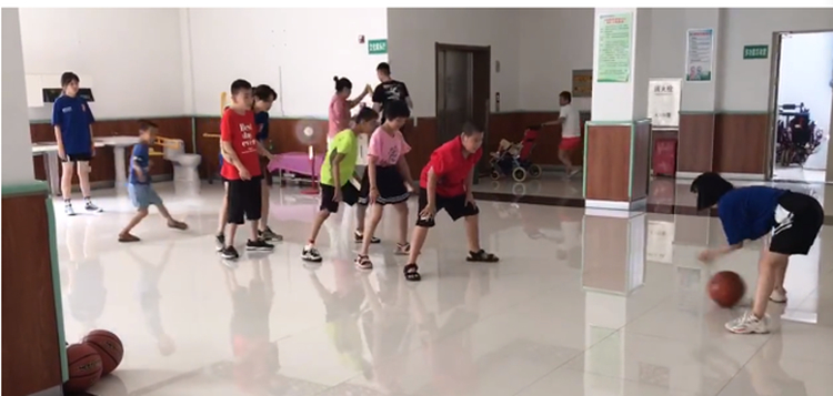 学生志愿者们,还把篮球运动引入脑瘫儿童康复训练中来,针对脑瘫儿童四肢不协调,活动不灵活的特点,把课堂上学到的训练原理与脑瘫儿童功能训练结合起来,手把手地教孩子们投球,抢球、运球,使孩子们在这些活动中,不知不觉的得到康复治疗,提高了手眼协调能力,反应能力,平衡能力。
