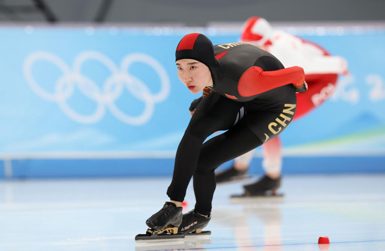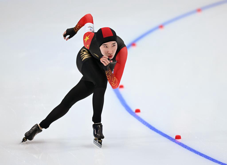 2月10日,中国选手韩梅在北京冬奥会速度滑冰女子5000米比赛中。新华社记者程婷婷摄