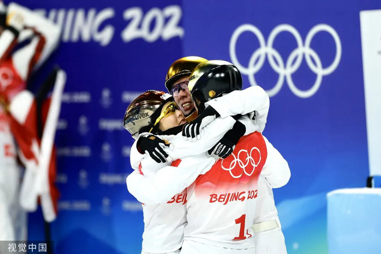 图为2月10日中国队选手徐梦桃(左)、贾宗洋(中)和齐广璞在赛后拥抱