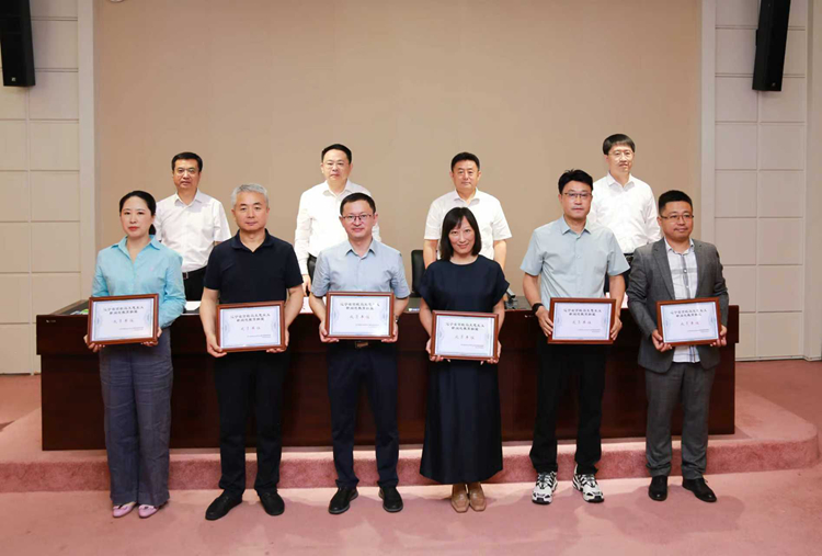 (前排左一)我校管理与新闻传播学院副院长王晓晨代表学院接受“辽宁省高校马克思主义新闻观教育联盟成员单位”证书