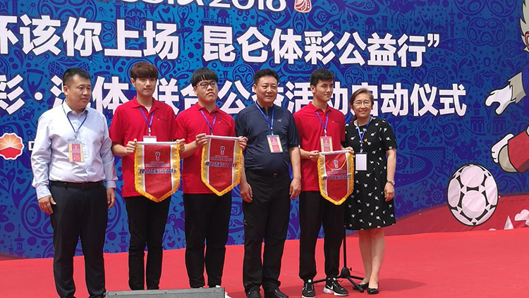 会上,体彩方、石油方领导和邹英分别致辞,三方领导佩戴“昆仑体彩公益行活动标识”并向我校大学生代表授旗。
