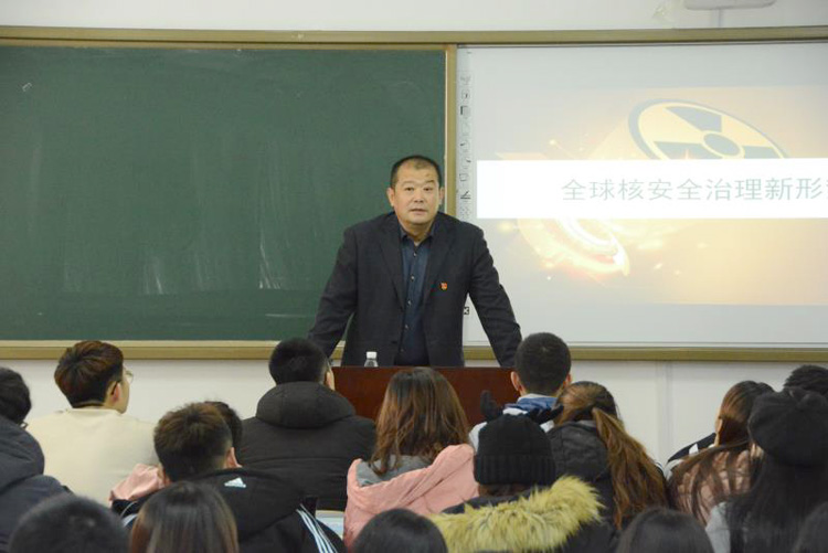 课上,樊占平为同学们讲解了核能的相关知识与对其应用的历史,并且分析了目前全球核安全治理的新形势。樊占平通过部分核能在军事上应用的例子,生动的阐释了当今世界上,只有掌握核武器才能在国际谈判中拥有话语权。随后,樊占平向同学们详细讲解了现代国际军事纠纷以及摩擦,对国际形势进行了分析。