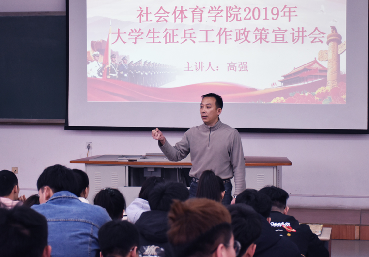 为深入贯彻教育部、中央军委国防动员部及我校毕业生征兵工作会议精神,3月21日,社会体育学院在教学楼111教室召开大学生征兵工作政策宣讲会,2015级全体毕业生和2016级部分同学参了加本次宣讲会,2015级辅导员高强主持并进行宣讲。