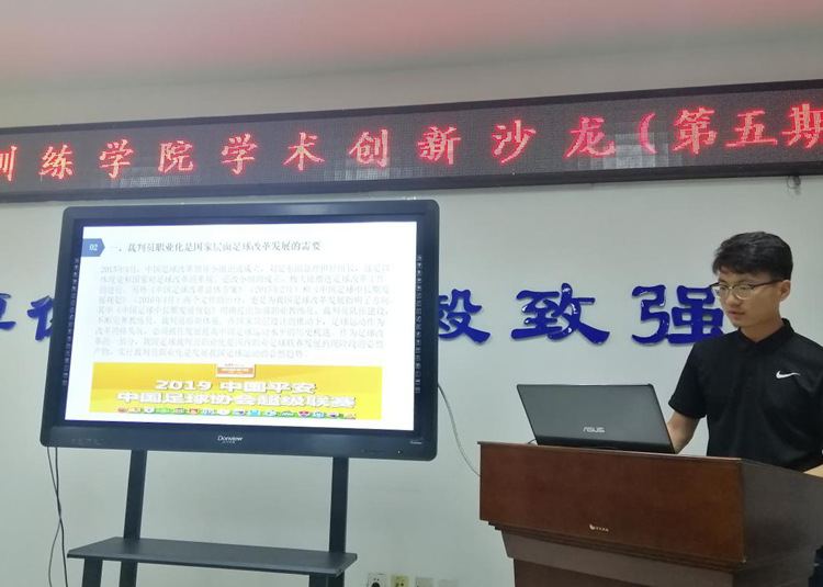 为营造良好的学术氛围,更好的培养学生的自学能力,6月10日下午,由运动训练学院主办、足球教研室承办、研究生弘毅共创团队协办的以“中国足球热点问题探讨”为主题的第五期学术创新沙龙在篮排球馆一楼会议室举行,运动训练学院院长于树祥,副院长于泉海、张麟寰,足球教研室主任张宏家、教师于波、王殿义、张树伟以及研究生共40余人参加了本次活动。本期邀请到4位2018级足球方向的研究生作为分享人,他们分别从不同的视角分享了自己对中国足球热点问题的认识和见解。