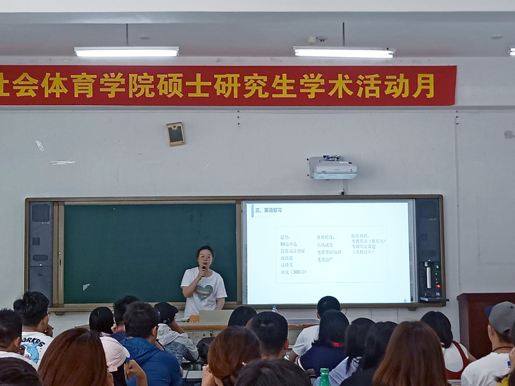 为培养社会体育学院硕士研究生学术素养,活跃研究生学术氛围,提高研究生培养质量,社会体育学院举办硕士研究生学术活动月系列活动,6月19日下午,学院在教学楼115教室召开研究生考博经验分享会,邀请到2016级体育新闻传播学席小惠和2013级体育管理学王昊作分享,本次分享会由社会体育学院副院长冯欣欣教授主持,社会体育学院2018级全体研究生参加。
