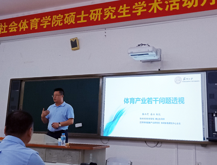6月21日上午,社会体育学院在教学楼115教室举办硕士研究生学术活动月第二次专题讲座,本次讲座特邀苏州大学樊炳有教授为研究生作《体育产业若干问题透视》专题讲座,休闲体育导师组组长徐通博士主持,社会体育学院部分教师及2018级全体研究生听取了讲座。