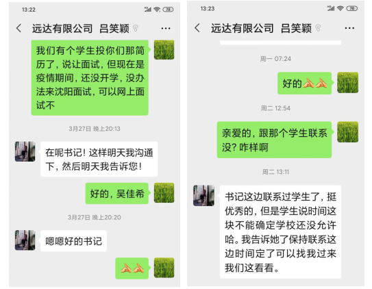 为积极应对新冠肺炎疫情影响,我院主动联系用人单位,积极为学生搭建与企事业单位之间的桥梁。3月27日,学院党总支副书记高鸿雁和辅导员主动与沈阳远达有限公司联系,了解该公司的用人需求后,积极推荐优秀毕业生,并促成了该公司与学生在3月31日进行网上面试。经过网上面试,该公司对我院学生感到非常满意,双方已经初步达成就业意向。