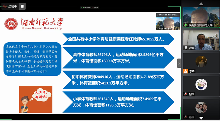 7月17日,我院第九期教师培训暨实习基地指导教师线上培训如期举行。本次培训邀请湖南师范大学博士生导师李先雄教授作《用什么来有效促进我国中小学体育活动繁荣》讲座,培训会由副院长刘排主持,学院全体教师、校外实习基地指导教师、各市地中小学体育教研员、2017级全体学生累计800余人参加了本次培训。