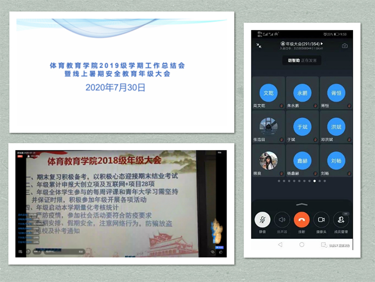 为进一步做好疫情防控常态化形势下的学生教育管理服务工作,加强对学生的安全意识教育,确保同学们能过一个安全、健康、有益、愉快的假期,体育教育学院各年级于7月30日-31日利用腾讯会议、钉钉等平台召开了学期工作总结会暨线上暑期安全教育年级大会。会议由各年级辅导员主持。