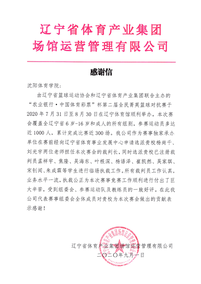 由辽宁省篮球运动协会和辽宁省体育产业集团联合主办的“农业银行·中国体育彩票”杯第二届全民菁英篮球对抗赛于7月31日至8月30日在辽宁体育馆顺利举办。本次赛会覆盖全省6岁--16岁和成人组所有组别,参赛运动员近1000人,累计完成比赛300余场。我院篮球教研室刘光宇、杨尚千两位老师担任本次赛会的裁判长,并带领本院孟祥宇、焦隆、吴海东、叶根深、杨语泽、崔凯然、吴家琪、宋钊闻、朱成霖等在校学生进行临场执裁工作。比赛工作任务繁重,但是我院师生克服困难,执裁过程中积极认真,公正准确,业务水平突出,受到组委会、参赛运动队及教练员的一致好评。他们均被评为本次赛会的优秀裁判员。