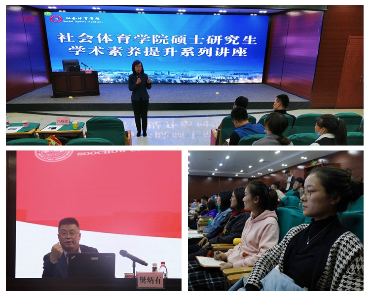 10月7日,本学期第一期社会体育学院硕士研究生学术素养提升专题讲座在图书馆一楼第一报告厅成功举办。本场讲座的主讲人是苏州大学体育学院樊炳有教授,社会体育学院院长冯欣欣教授主持,社会体育学院全体研究生听取了讲座。