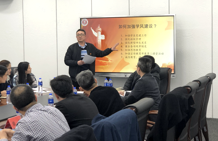 与会17名辅导员围绕“严谨勤奋、求实创新,如何加强我校学生学风建设”主题,根据各学院学生专业特点、学风现状、存在问题深入思考,交流强化学风建设的特色举措。交流研讨后,参会人员就通过加强学生党建工作、强化班级管理、强化新型师生关系、健全各项规章制度、加强思想教育、加强宣传教育、开展第二课堂活动、端正教风等措施强化学风建设达成共识。