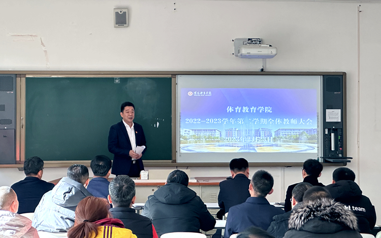 2月23日,体育教育学院在教学楼115教室召开全体教师大会,学院新一届领导班子与大家见面,同时部署2023年工作任务,明确工作要求。体育教育学院全体教职工参会,会议由学院办公室主任李峰主持。