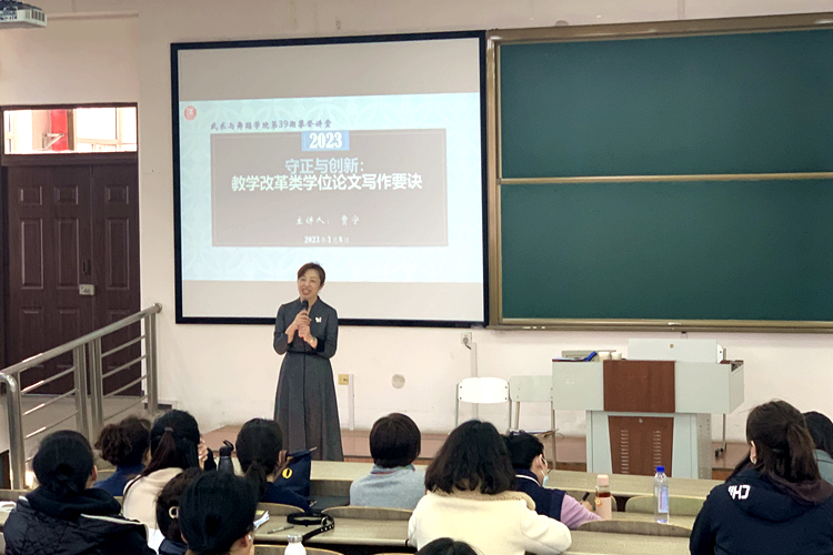 讲座中,贾宁以守正创新为主题思想从选题等基本问题、与优质文献“交朋友”、方法为我所用以及科学精神与科研勇气等四个方面展开本次讲座,深入浅出地阐述了教育教学改革类论文的撰写方法。同时,贾宁针对部分研究生提出的疑惑给予了耐心解答,并探讨了论文撰写中存在的问题。师生们纷纷表示通过此次讲座增强了科研创新的信心,拓宽了撰写论文的思路。