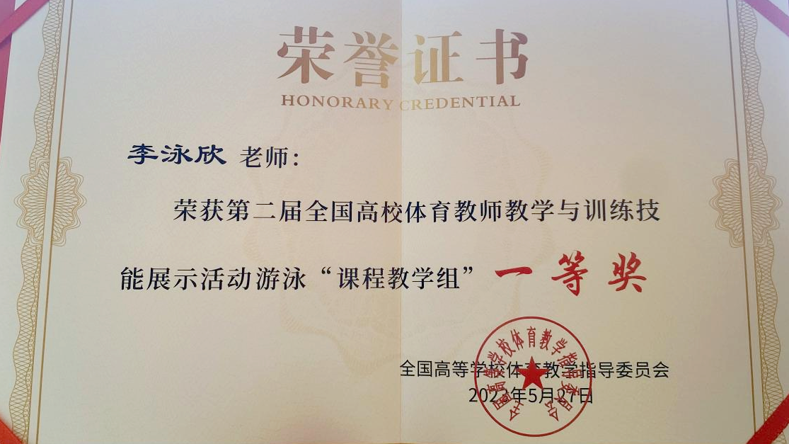 5月25日—27日,由教育部全国高等学校体育教学指导委员会主办、浙江财经大学承办的第二届全国高校体育教师教学与训练技能展示活动,在浙江省杭州市落下帷幕。来自全国146所高校195名选手参加本次展示活动。我校游泳教研室李泳欣老师获得该项赛事游泳课程教学组一等奖。