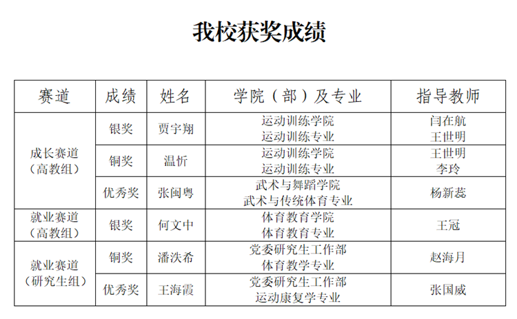 学校高度重视赛事组织工作,组织各学院(部)师生积极参与,共有3046名学生报名参赛,接近全校学生总数的50%。经过各学院(部)初赛、学校决赛,特邀专家开展多轮集训、赛前路演等,助力学生打磨职业规划方案,强化实践育人成果展示,不断提升项目质量和选手水平。最终,运动训练学院贾宇翔、温忻获得成长赛道银奖和铜奖,武术与舞蹈学院张闽粤获得成长赛道优秀奖;体育教育学院何文中获得就业赛道银奖,党委研究生工作部潘泆希、王海霞获得就业赛道铜奖和优秀奖。