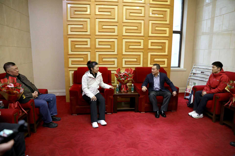 高向辉代表学校向王心迪、徐梦桃在米兰冬奥会上取得的辉煌战绩致以最热烈的祝贺和最崇高的敬意。他表示,你们在冬奥赛场上奋勇拼搏,为祖国争得了荣誉,为家乡辽宁增添了光彩,更为母校沈阳体育学院赢得了无上荣光,你们是中华民族的优秀儿女,是沈体师生的骄傲与榜样,沈体因你们而自豪!