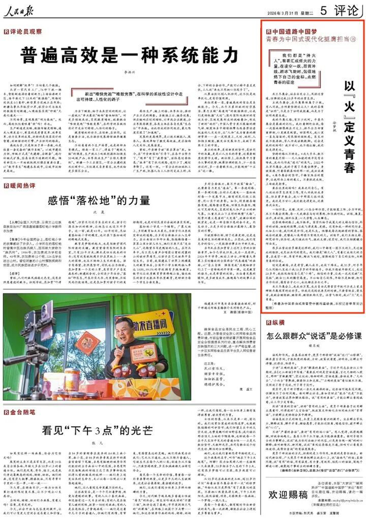 我校教师、中国自由式滑雪空中技巧运动员徐梦桃在3月31日出版的《人民日报》评论版刊发署名文章《以“火”定义青春》。