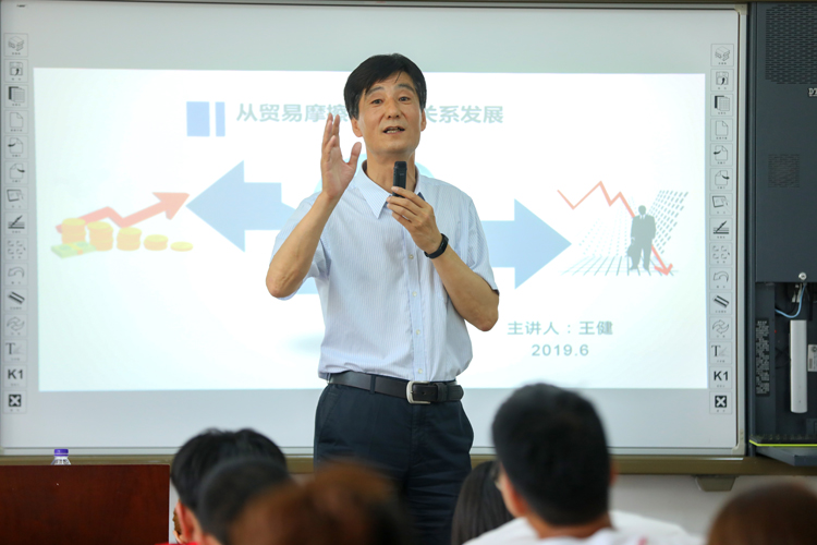 王健为同学们解读了当前美国因贸易保护主义、单边主义抬头,挑起与中国等多国的贸易摩擦。他讲到,随着经济全球化进程的不断推进,国际合作关系更为深入,全球经济越来越成为真正的休戚与共的“命运共同体”。虽然当前经济全球化的发展遭遇寒流、暗流、逆流,但改变不了主流。他强调,中国是经济全球化的坚定捍卫者,为全球经济的稳定和健康发展作出了重要贡献。这正是经济全球化的要义所在。