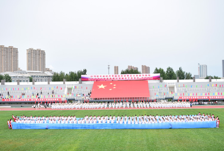 开幕式现场,一面巨大的五星红旗铺展在沈阳体育学院田径场看台上,“不忘初心、牢记使命”八个大字醒目悬挂,场内红幅高挂,彩旗飘扬,到处洋溢着比赛的欢乐气氛。8时30分,伴随着激昂的乐曲,国旗、旗海、花束方阵和全体裁判员、运动员有序入场。