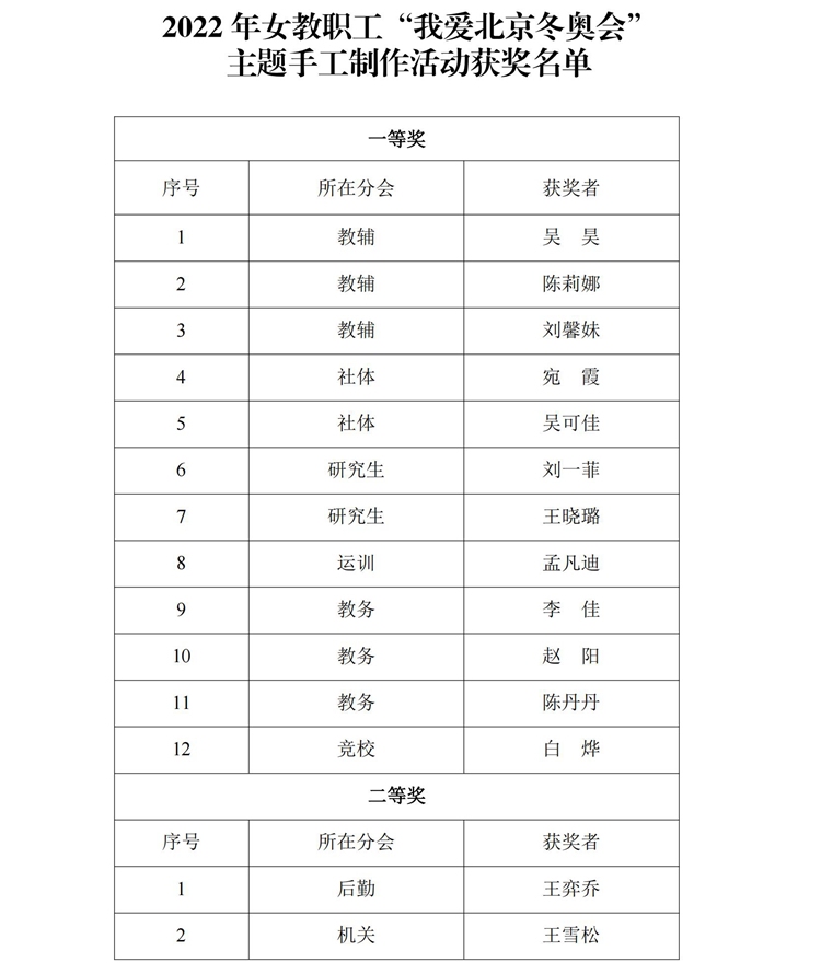 在第112个“三八”国际劳动妇女节来临之际,为庆祝我校在北京冬奥会取得优异成绩,3月8日-9日,由校工会主办,各分会承办的“我爱北京冬奥会”主题手工制作活动在各分会场举行,共有12个分会300余名女教职工参与此次活动。经过各分会择优推荐,校评选小组评选,最终评选出一等奖12名、二等奖12名、三等奖12名和优秀奖24名。