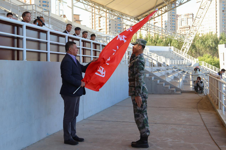 院长刘征向沈阳体育学院大学生军训团授旗。