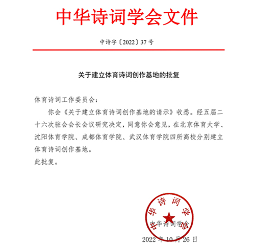 近日,经中华诗词学会五届二十六次驻会会长会议研究决定,在我国体育院校建立体育诗词创作基地,我校与北京体育大学、成都体育学院、武汉体育学院4所院校入选。