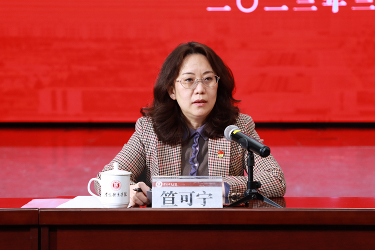 副院长笪可宁作学校“申博”工作报告。她从历史逻辑、实践逻辑和发展逻辑三个方面梳理和总结了学校“申博”工作情况,在肯定“申博”工作成绩的同时,科学分析了学校2023年“申博”面临的形势,她强调,全校上下要坚定信心、心无旁骛、勇毅前行,实现“申博”决战决胜,推动学校办学质量和层次迈上新台阶。