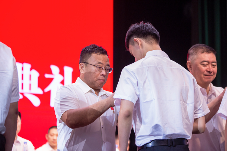 学校领导为新生代表佩戴校徽。