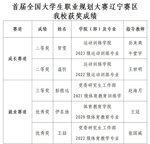 3月5日至11日,首届全国大学生职业规划大赛辽宁赛区决赛圆满落幕。经过激烈比拼和全方位展示,我校运动训练学院贺雯、温忻获得成长赛道二等奖,党委研究生工作部彭德远获得就业赛道三等奖,体育教育学院伊名扬、党委研究生工作部王喆获得优秀奖。