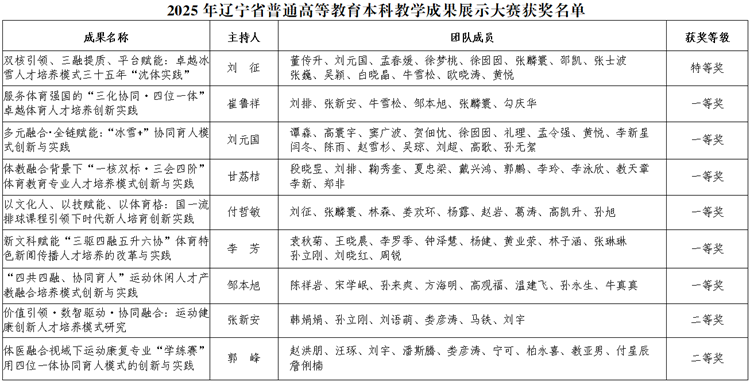 此次获奖成果涵盖人才培养模式创新、课程体系建设、实践教学改革等多个领域,集中彰显了学校持续深化教育教学改革、坚持高质量育人,主动服务体育强国战略的扎实成效。学校将以此为契机,持续深化教育教学改革,不断提升人才培养质量,为冲击国家级教学成果奖奠定坚实基础,为学校高水平大学建设注入强劲动力,为辽宁教育强省建设贡献“沈体力量”。
