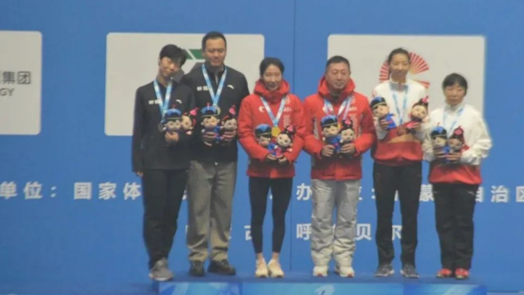 韩梅(左三)与教练员杨忠杰(左四)领奖瞬间