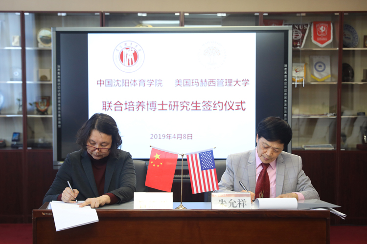 在热烈的氛围中,曹继红与朱允祥分别代表双方学校签署了《中国沈阳体育学院与美国玛赫西管理大学联合培养博士研究生合作协议》。