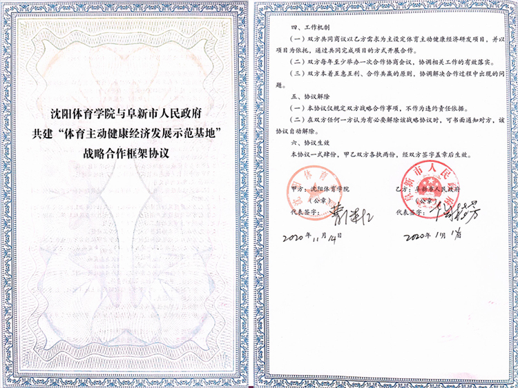 为积极服务健康中国战略、助力辽宁全面全方位振兴、落实辽宁省教育厅2020年批准的体育主动健康研究院重大研究项目,提升我校服务社会的水平,11月14日,副院长曹继红带队,相关部门负责人陪同,赴阜新市宝地温泉小镇分别与阜新市人民政府、辽宁宝地主动健康服务(辽宁)集团签订了体育主动健康经济发展示范基地和体育主动健康研究院共建协议。