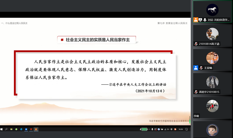 12月7日,院长刘征为体育教育学院2021级体育教育专业1—4班学生讲授习近平新时代中国特色社会主义思想概论课第七讲:发展全过程人民民主。